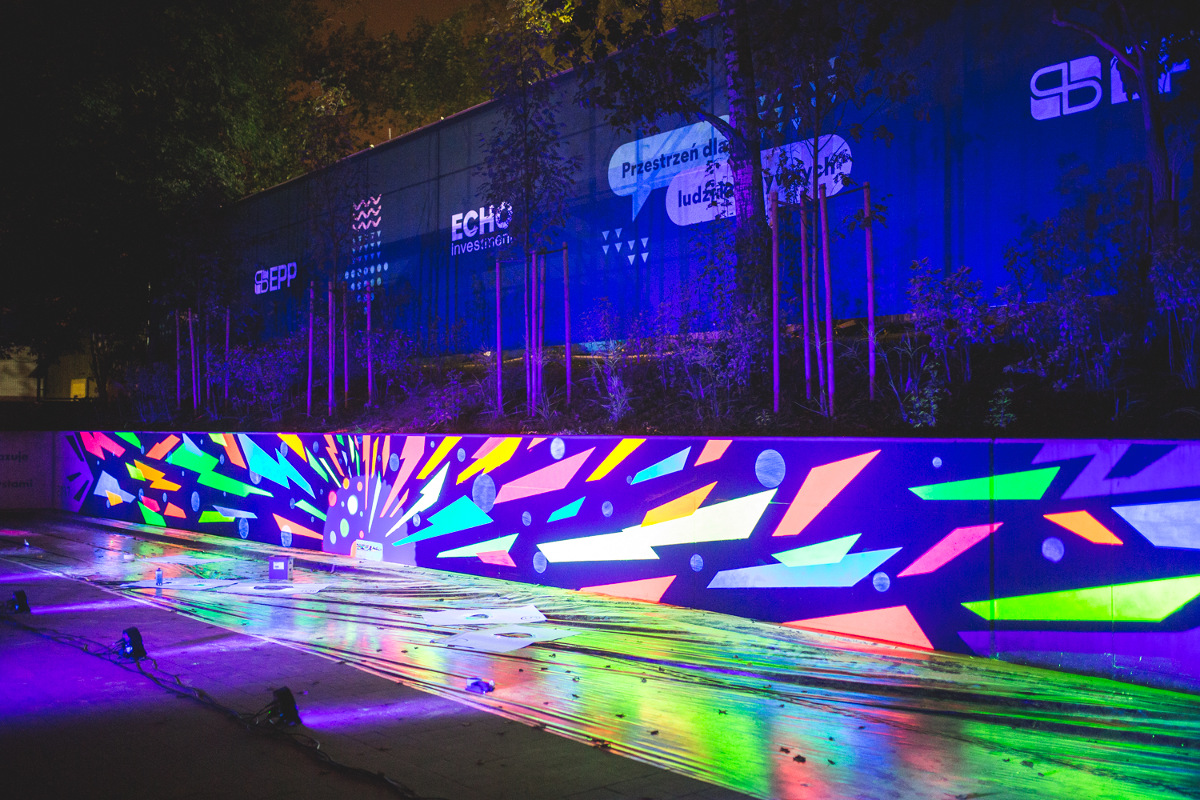 - To pierwsza praca, w ktorej wykorzystuję technikę ultrafioletu, co sprawia, że praca ożywa po zmroku. To trzeci raz, kiedy przy kreowaniu obrazu pomogli mi inni ludzie, z których każdy miał swój wkład w ostateczny efekt. Ideą dzieła jest wybuch, który rozchodzi się symetrycznie, co stanowi nawiązanie do koncepcji architektonicznej Symetris Business Park” – powiedział Adam „Kruk” Wirski po zakończeniu pracy.